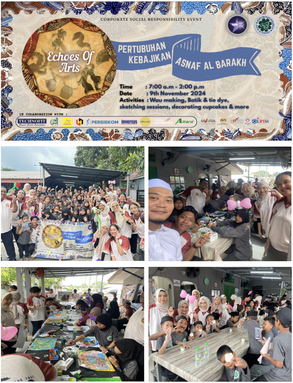 The “Echoes of Arts” Corporate Social Responsibility (CSR) programme was successfully held on 9 November 2024 at Pertubuhan Kebajikan Asnaf Al Barakh (PKAAB). Organized by BK101 Semester 4 students, this marked their first CSR initiative, creatively integrating Malaysian traditional arts into a meaningful community engagement.