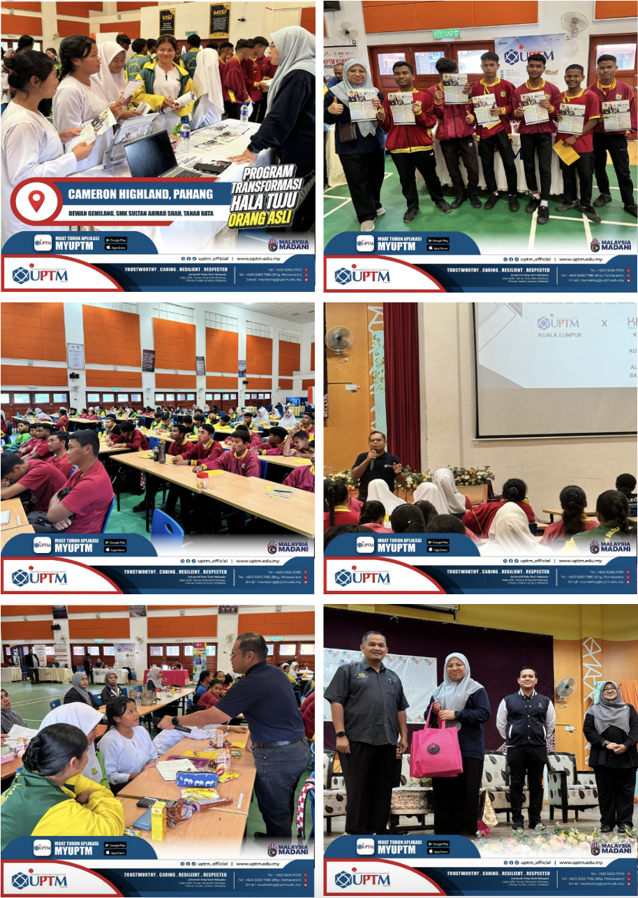 UPTM representatives attended the Orang Asli Direction Transformation Program held at SMK Sultan Ahmad Shah, Tanah Rata, Cameron Highlands, Pahang. The program, organized by Yayasan Pelajaran MARA in collaboration with the Cameron Highlands District Education Office, aimed to provide educational exposure and guidance on future learning pathways for students, particularly from the Orang Asli community. The session successfully created awareness among participants, and it was hoped that the knowledge shared would benefit them in pursuing their educational goals.