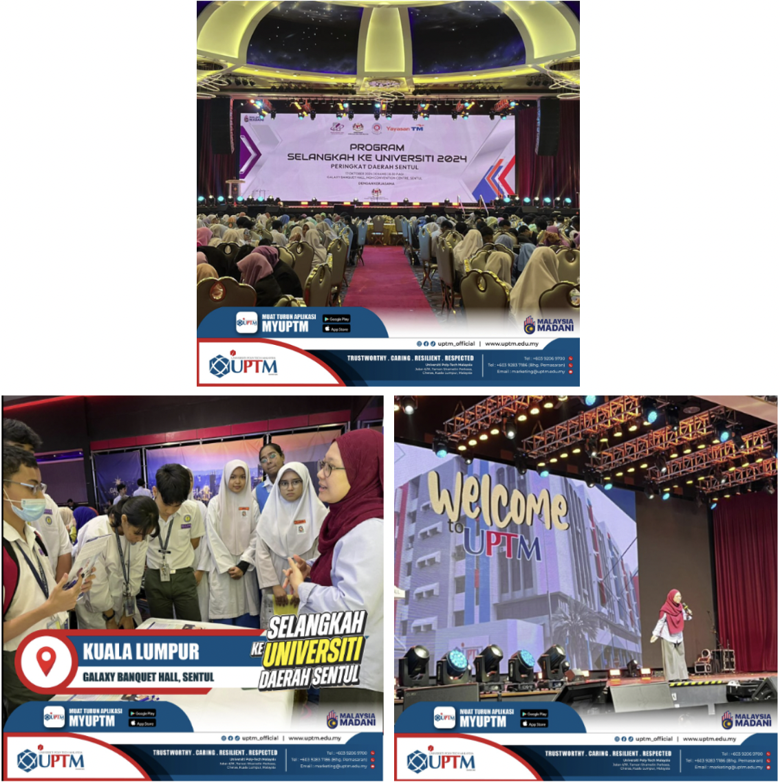 The MARA State of Penang Career Carnival & Rural Education Tour 2024 took place on June 27 and 28, 2024, at the Perda Convention Centre, Kubang Menerong, Penang. Organized by the Penang State Education Department and the Penang State Majlis Amanah Rakyat (MARA), the program involved the participation of 4,000 secondary and primary school students from North Seberang Prai. The event was officiated by Dr. Mohd Ikhmal bin Fadzil, Special Officer (Education & Higher Education) to the Deputy Chief Minister I of Penang. University Poly-Tech Malaysia (UPTM) was represented by Mr. Mohd Azidee bin Mohamad Zin from the Marketing & Student Recruitment Department.