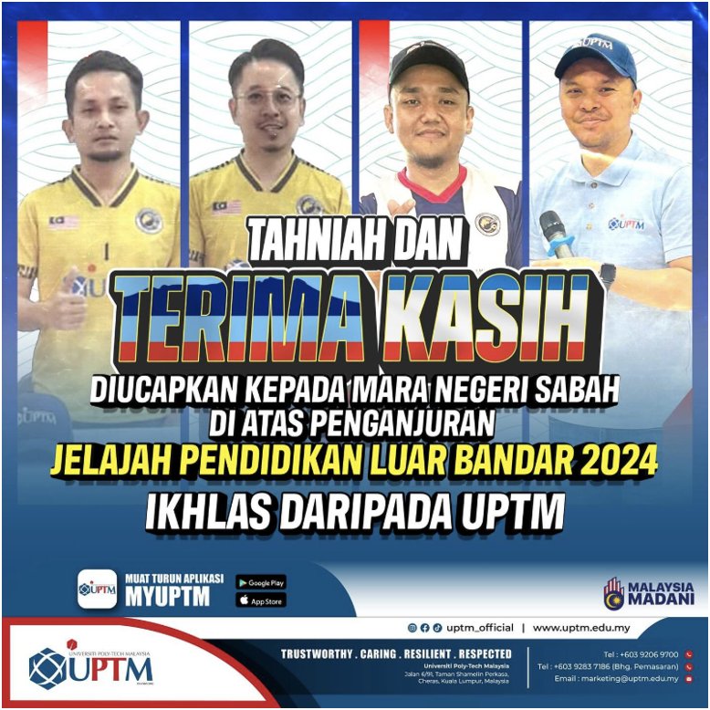 Congratulations and thank you to MARA Negeri Sabah for organizing the Rural Education Tour which was held from August 22 to September 9, 2024. It is hoped that UPTM's involvement in this program will benefit all students in Sabah. Hope to see you again in the future.