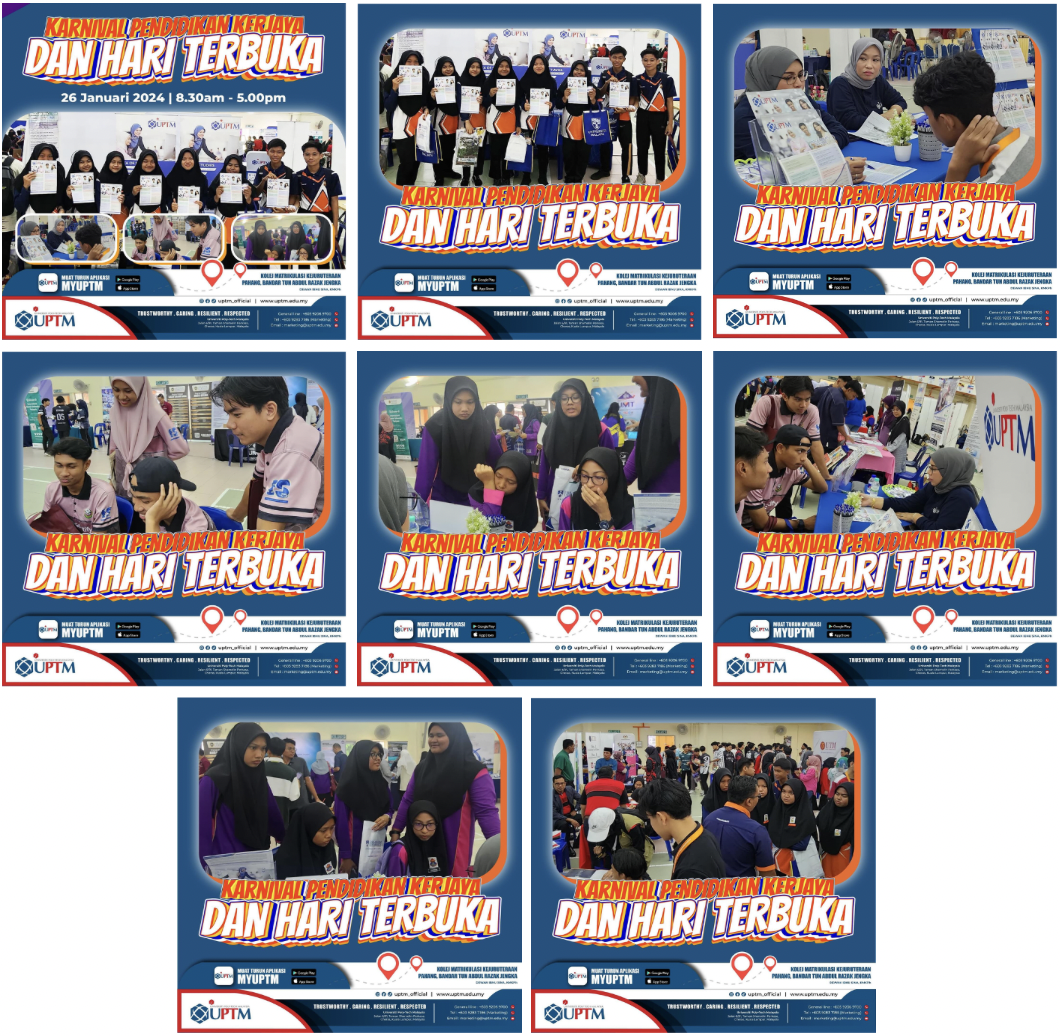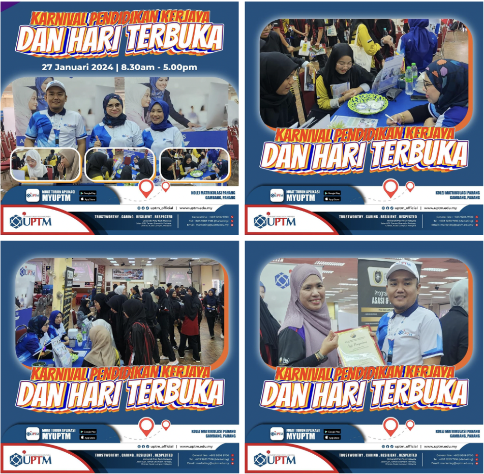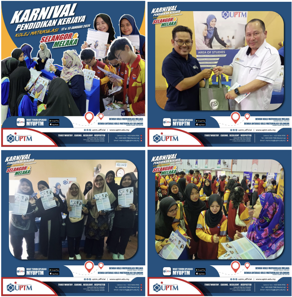 The Kolej Matrikulasi Career Education Carnival 2024 was held on January 12 and 13, 2024, at the Kolej Matrikulasi Melaka Hall in Masjid Tanah, Melaka, and the Dewan Antaras, Kolej Matrikulasi Selangor, in Mukim Jugra, Selangor. Organized by the respective matriculation colleges, the program provided students with briefings and exposure on pathways to pursue higher education at Universiti Poly-Tech Malaysia (UPTM). The sessions also introduced students to various career opportunities related to their chosen fields of study at the university level.