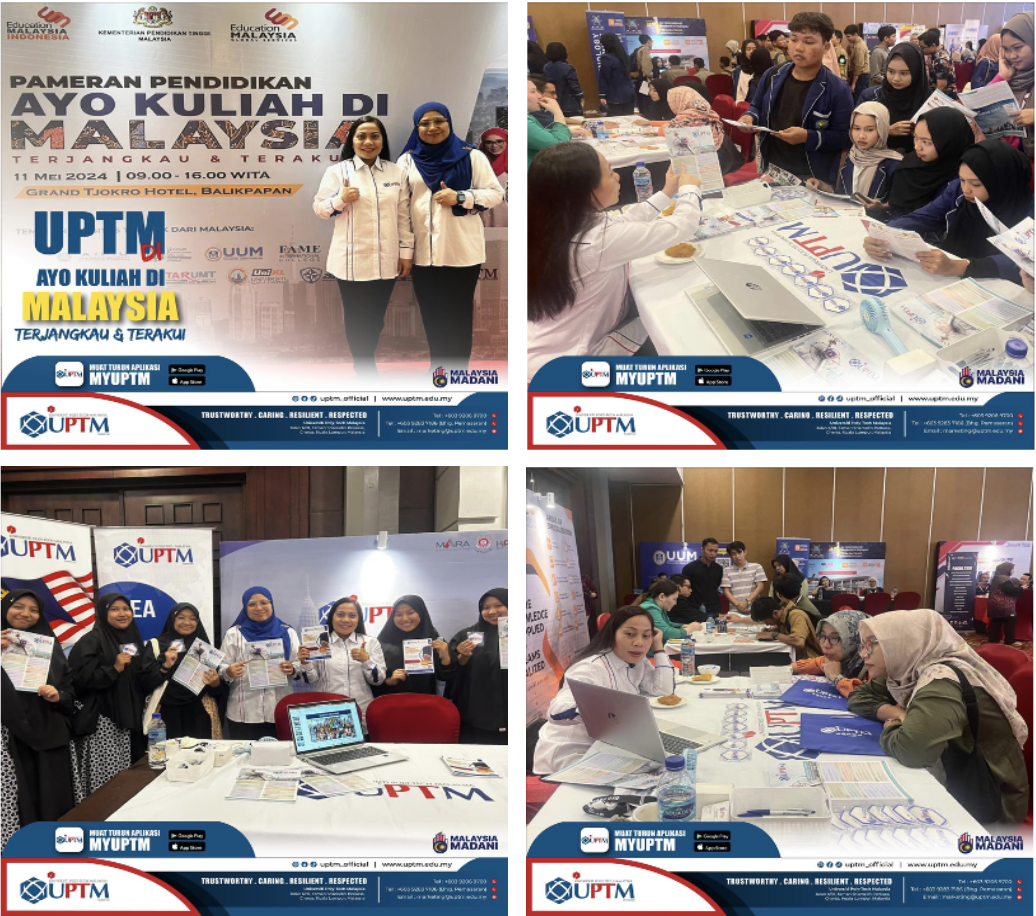 The "Let's Study in Malaysia" Education Fair was held on 11 May 2024, at the Grand Tjokro Hotel in Balikpapan, Kalimantan, Indonesia. Organized by Education Malaysia Global Services (EMGS), the event saw participation from 13 Malaysian higher education institutions, including Universiti Poly-Tech Malaysia (UPTM). UPTM was represented by Dr. Nurul Fitri binti Mohd Noor, Senior Lecturer from the Faculty of Business, Accounting & Social Sciences, and Puan Zuhaida binti Zaharuddin from the International Student Unit, Student & Alumni Affairs Division. The fair targeted students who had completed Grades 11 and 12, as well as diploma graduates, to pursue their studies in Malaysia. This initiative aimed to strengthen UPTM’s brand visibility and international network while encouraging greater enrolment of international students in the future.