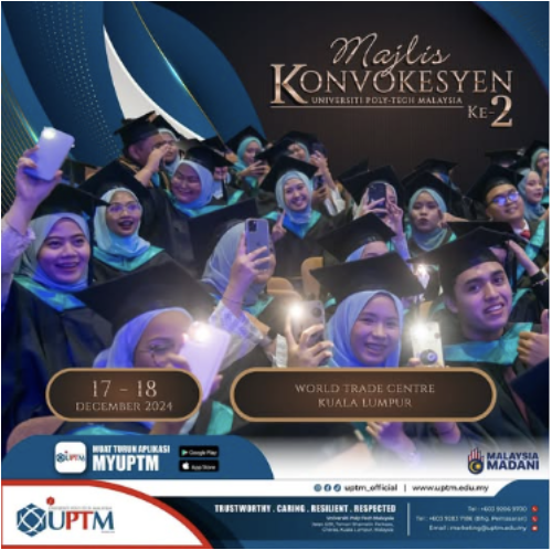 On 17 and 18 December 2024, Universiti Poly-Tech Malaysia (UPTM) successfully held its 2nd Convocation Ceremony. The event was to celebrate the achievements of graduates in a lively and dignified atmosphere. The convocation brought together students, parents, lecturers, and university leaders in a momentous occasion that reflected UPTM’s commitment to academic excellence and student success. The hall was filled with smiles, applause, and a sense of accomplishment as graduates proudly received their scrolls, marking an unforgettable milestone in their academic journey.