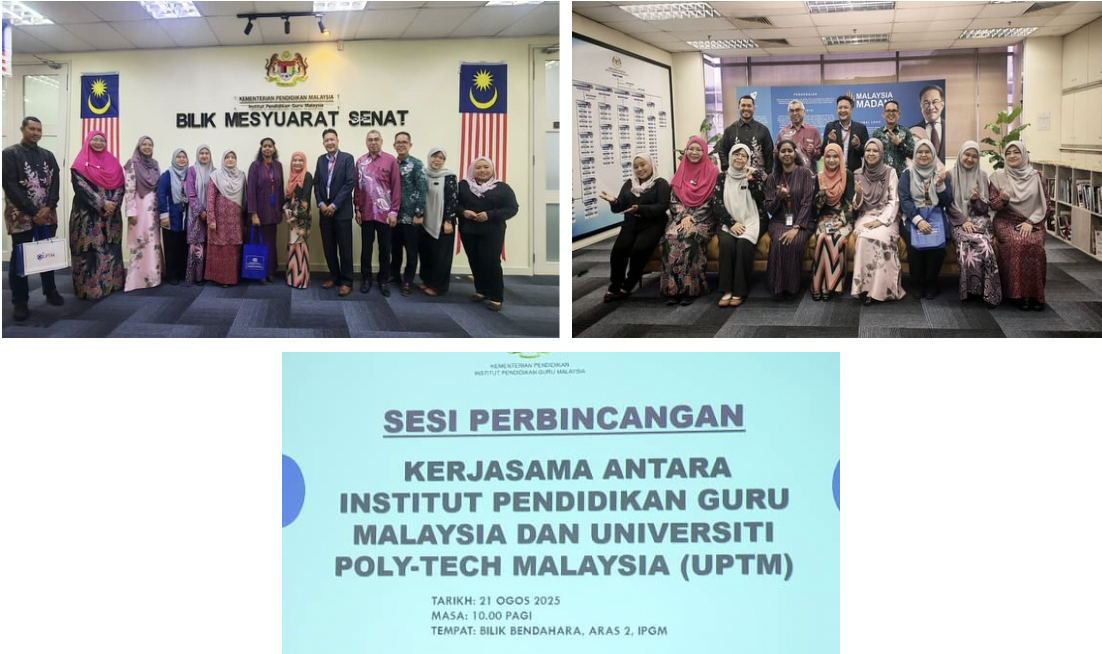 As part of its efforts to strengthen strategic academic partnerships, a collaborative session was held between Universiti Poly-Tech Malaysia (UPTM) and Institut Pendidikan Guru Malaysia (IPGM) on 21 August 2025 at 10.00 a.m. in the Senate Meeting Room, IPGM Cyberjaya. The session served as a platform to discuss potential collaborations in education, research, and capacity building, reflecting UPTM’s involvement in initiatives that support national education strategies and policy development. This engagement aligns with SDG 4 (Quality Education) and SDG 17 (Partnerships for the Goals). The session was attended by representatives from both UPTM and IPGM, including Dr. Sangeeth (Dean of FESSH), Dr. Mohd Zuri Ghani (ECE Senior Lecturer), Madam Cynthia (ECE Coordinator) and Madam Norhayati (Director of AAS).