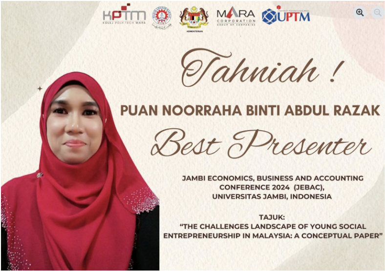 Congratulations to Pn. Noorraha binti Abdul Razak, Lecturer in Business Studies, Faculty of Business and Accounting (FABA), for being selected as the Best Presenter at the Jambi Economics, Business and Accounting Conference 2024 (JEBAC), held at Universitas Jambi, Indonesia, in September 2024. The UPTM community is proud of this remarkable achievement.