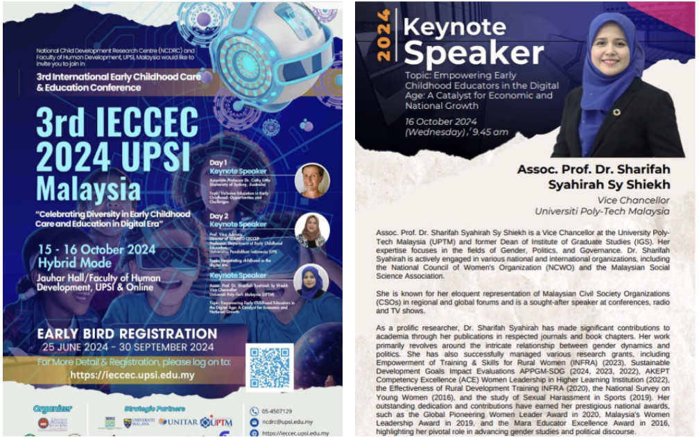 YBhg. Associate Professor Dr. Sharifah Syahirah binti Sy Shiekh, Vice-Chancellor of Universiti Poly-Tech Malaysia (UPTM), was invited as the Keynote Speaker at the 3rd International Early Childhood Care & Education Conference (IECCEC) 2024 held at Sultan Idris Education University (UPSI). She will deliver a keynote address titled “Empowering Early Childhood Educators in the Digital Age: A Catalyst for Economic and National Growth” on Wednesday, 16 October 2024.
