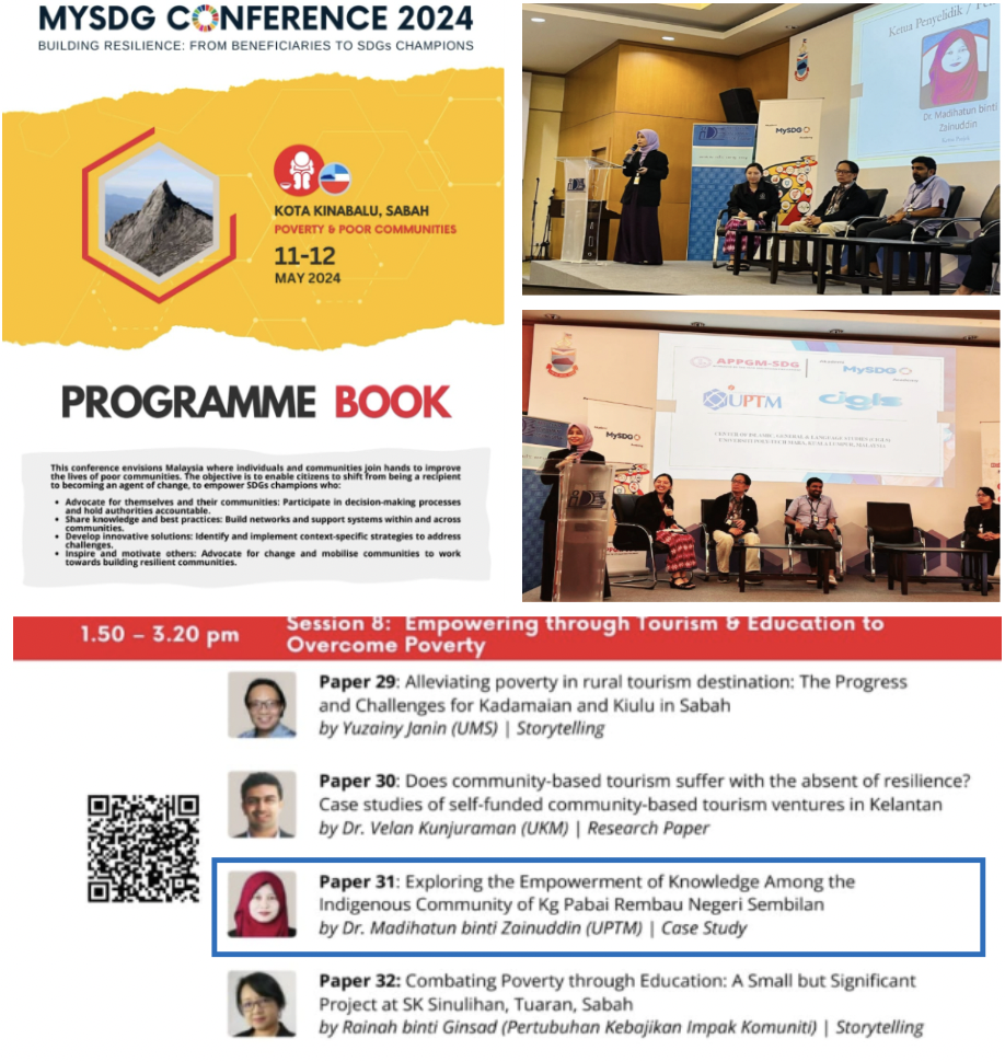 Dr Madihatun binti Zainuddin, a Senior Lecturer from the Centre of Islamic, General and Language Studies (CIGLS), attended the MYSDG Conference 2024 held on 11 to 12 May 2024 in Kota Kinabalu, Sabah. She presented a case study entitled “Exploring the Empowerment of Knowledge among the Indigenous Community of Kg Pabai, Rembau, Negeri Sembilan.”