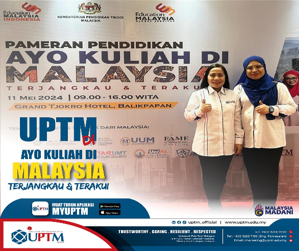 On 11 May 2024, the "Let's Study in Malaysia" Education Fair took place at the Grand Tjokro Hotel in Balikpapan, Kalimantan, Indonesia, organized by Education Malaysia Global Services (EMGS). UPTM was represented by Dr. Nurul Fitri binti Mohd Noor, a Senior Lecturer from the Faculty of Business, Accounting & Social Sciences, and Puan Zuhaida binti Zaharuddin from the International Student Unit, Student & Alumni Affairs Division.