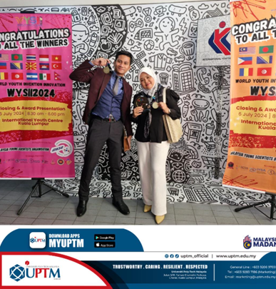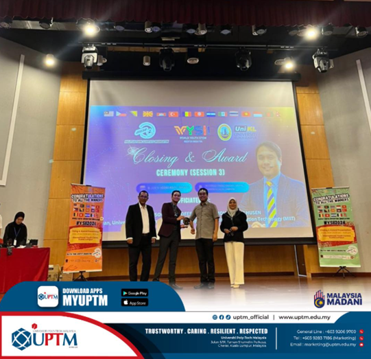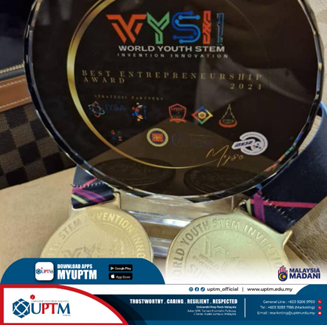 Congratulations to Mohd Amiruldaniel bin Abdul Nasir from the UPTM Research and Innovation Club for his remarkable achievement in winning the Gold Award and Special Awards Indonesia Young Scientist Association Award, Best Entrepreneurship Award, and Best Presentation at the World Youth STEM Innovation competition organized by the Malaysia Young Scientist Organisation (MYSO).