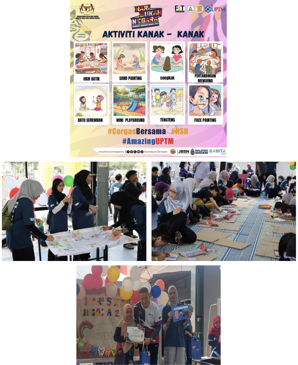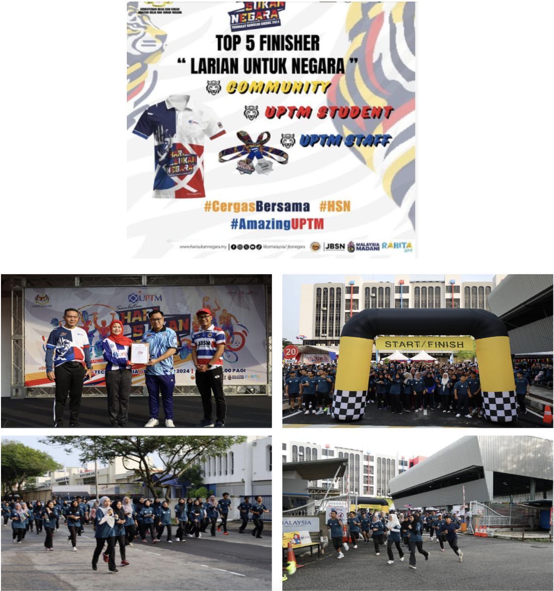 The excitement of National Sports Day /Hari Sukan Negara (HSN) 2024 at the Cheras District level was celebrated with great enthusiasm at UPTM on 12 October 2024 (Saturday). UPTM was selected as the host for the Cheras area in collaboration with the Federal Territory Department of Youth and Sports. A total of 1,000 participants, including local residents, students, and UPTM staff, took part in the event.