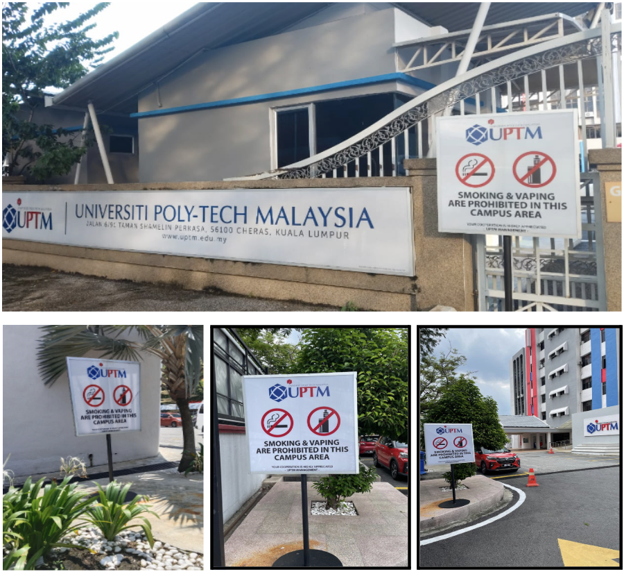 Notices and reminders regarding regulations and prohibitions within the campus have been displayed throughout Universiti Poly-Tech Malaysia (UPTM). These notices aim to promote health, safety, and well-being among students, staff, and visitors by encouraging safe practices and creating a healthy campus environment.